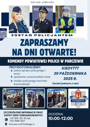 W poniedziałek 20 października 2025 r. w godz. 10:00 -12:00 w budynku parczewskiej komendy odbędą się dni otwarte jednostki. Zapraszamy uczniów, studentów, osoby zainteresowane specyfiką służby w Policji, aby zapoznały się z zasadami rekrutacji czy etapami postępowania kwalifikacyjnego. Odpowiemy na wszelkie pytania oraz pokażemy czym zajmujemy się na co dzień, jaki sprzęt wykorzystujemy w służbie oraz zgłębimy tajniki pracy technika kryminalistyki. Jesteś zainteresowany?Przyjdź i przekonaj się sam, a być może zostaniesz jednym z nas.