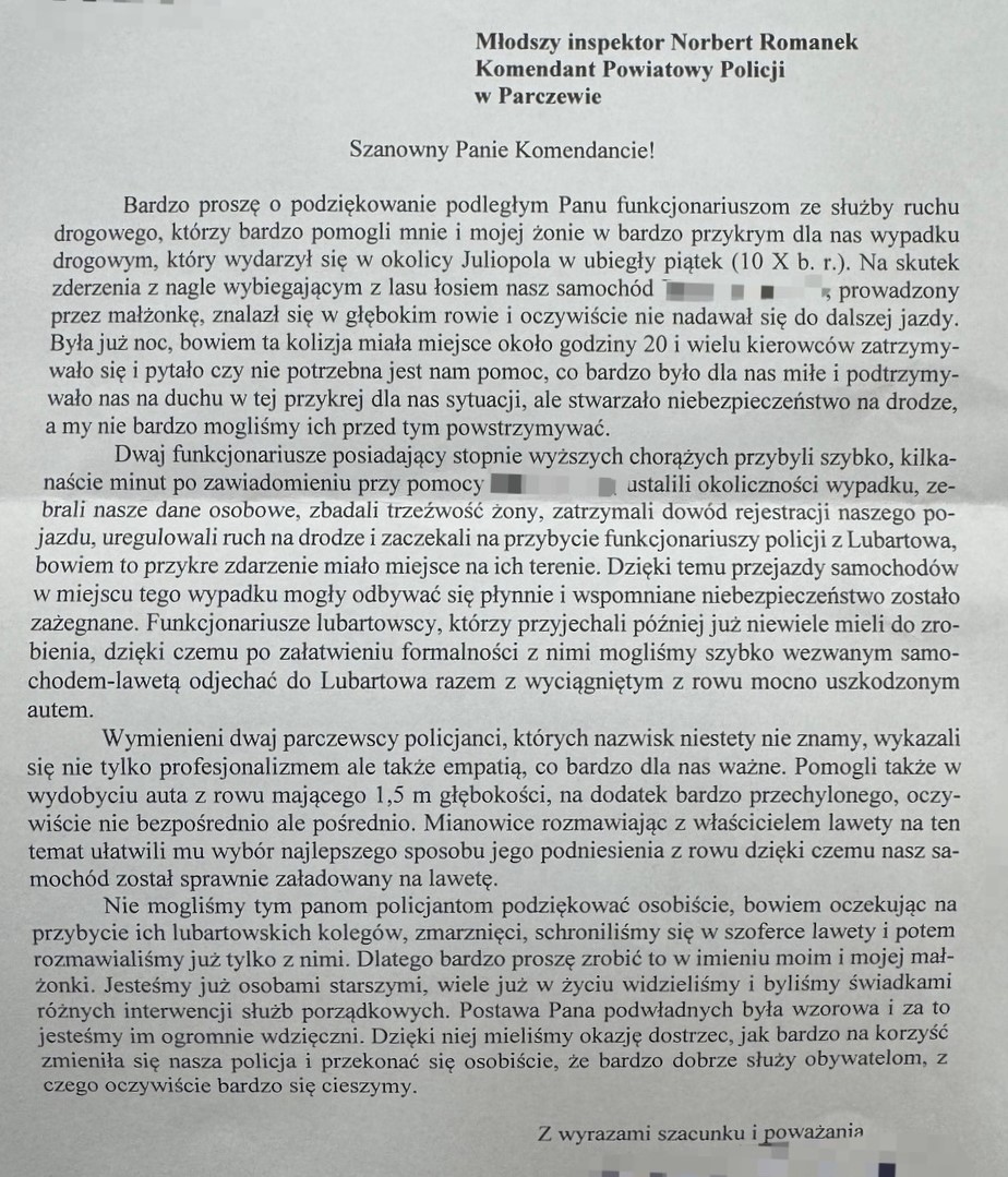 Jak można wyczytać w liście, małżeństwo z Lublina, by uniknąć bezpośredniej kolizji z łosiem swoim autem wjechało do rowu. Było ciemno i zimno, a po telefonie na numer alarmowy policjanci ruchu drogowego znaleźli się na miejscu kilka minut od zgłoszenia.